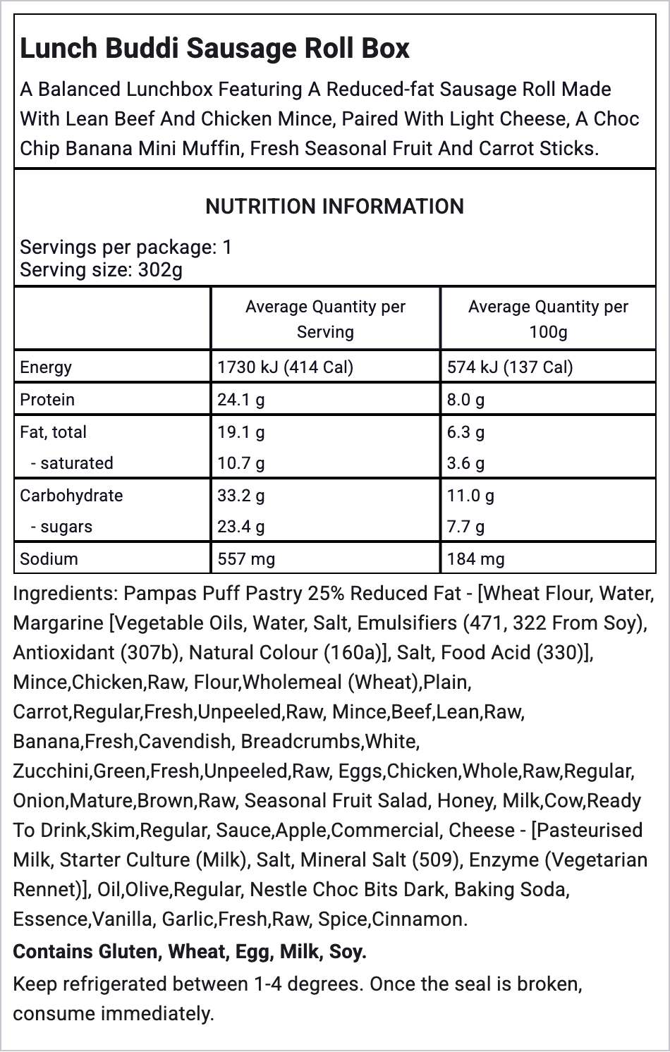 Nutritional values provided are based on standard recipes. As this product contains seasonal fruit salad, the nutritional content may vary slightly depending on the type and availability of fruit used throughout the year.